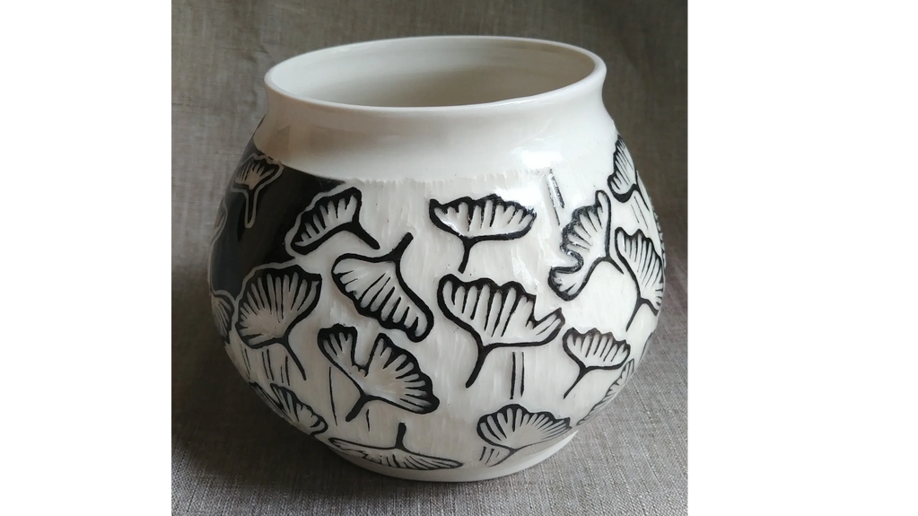 Ginkgo Vase, Black and cream white stoneware. 4" tall. Free delivery in Chittenden County, Vermont. Additional charge for shipping